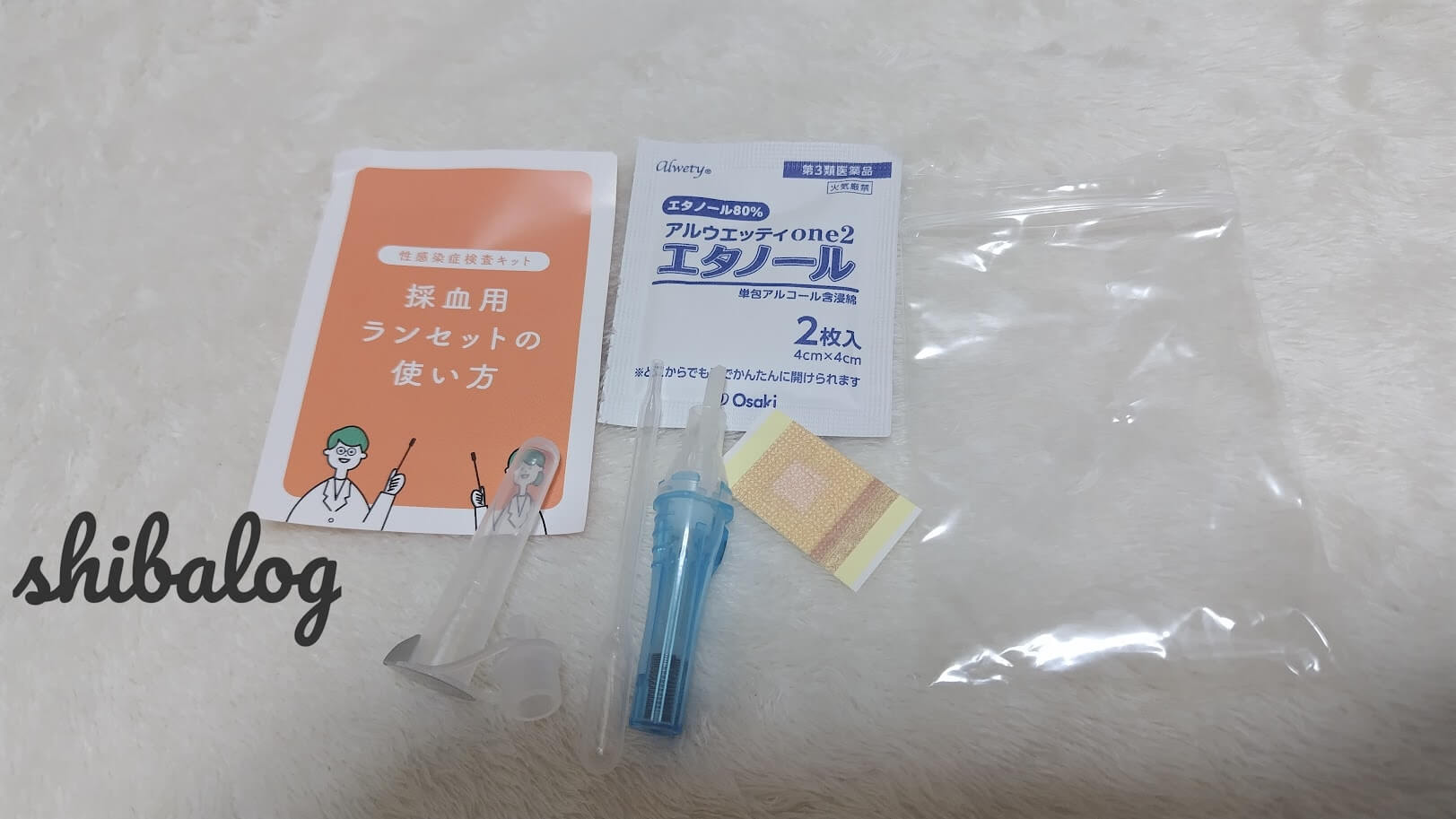 左から希釈液・ピペット・採血用ランセット・絆創膏です。