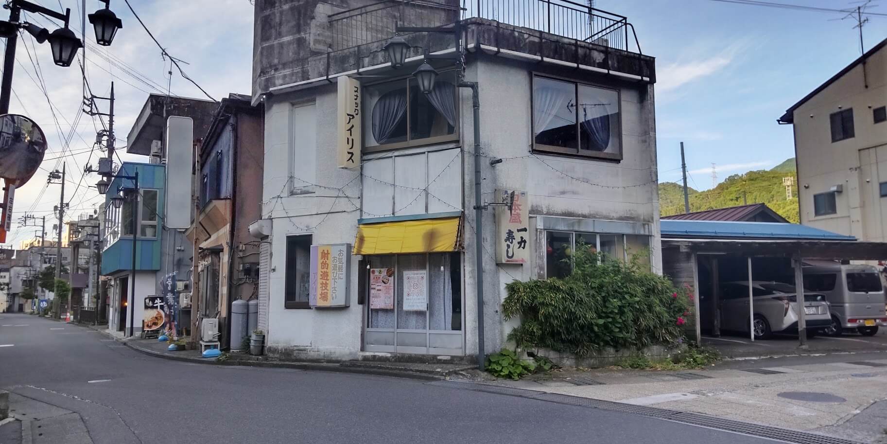 写真右側に射的やスマートボールの看板が見えますが、残念ながら営業されていません。