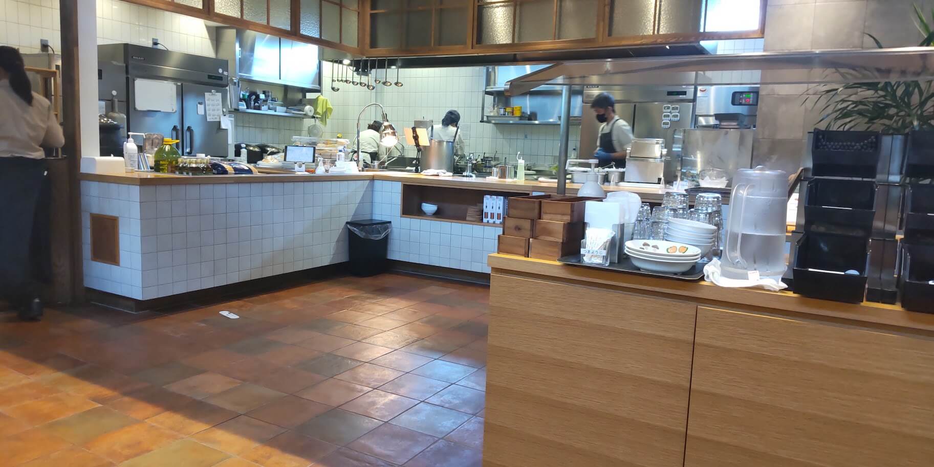写真右側にお箸やフォークがあり、お水等もセルフです。