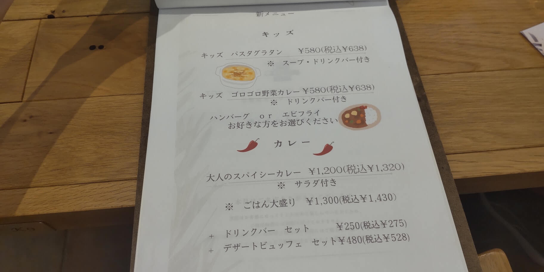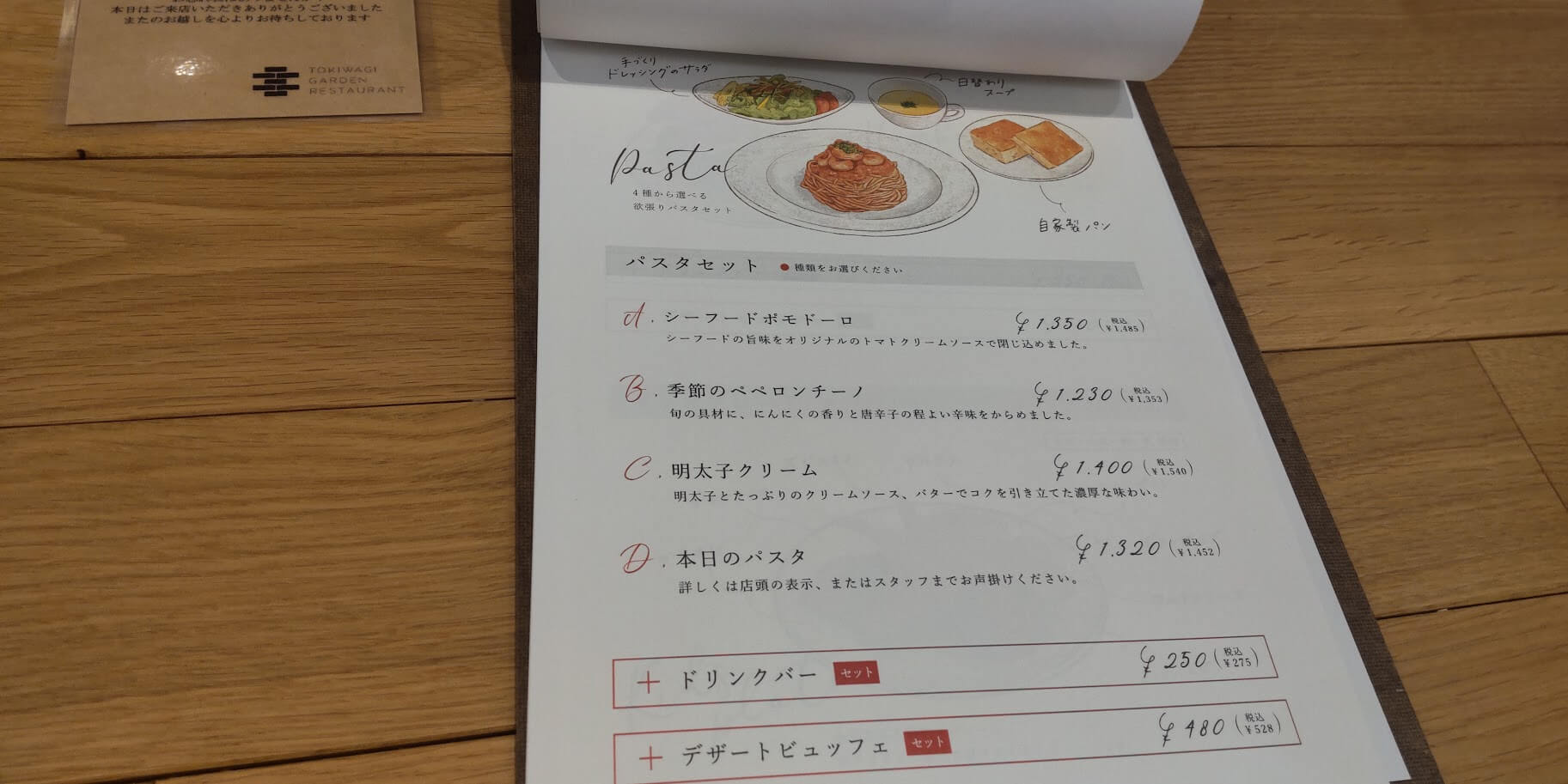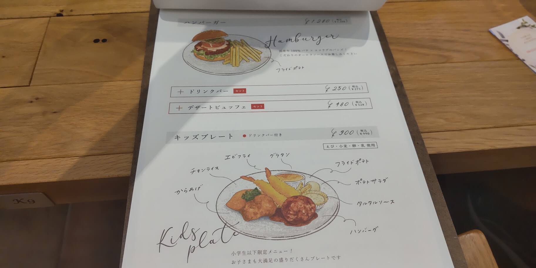 ハンバーグにパスタに色々と食事メニューがあって、食事メニューを注文すると+275円(税込)でドリンクバー、+528円(税込)でデザートビュッフェをつけることができます。