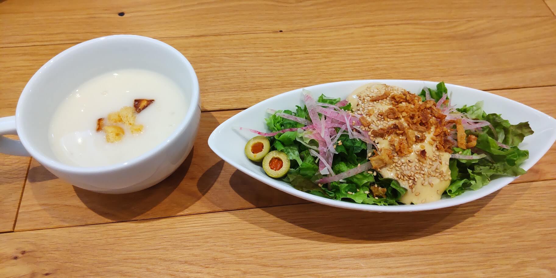 注文後すぐにサラダとコーンスープが到着しました。