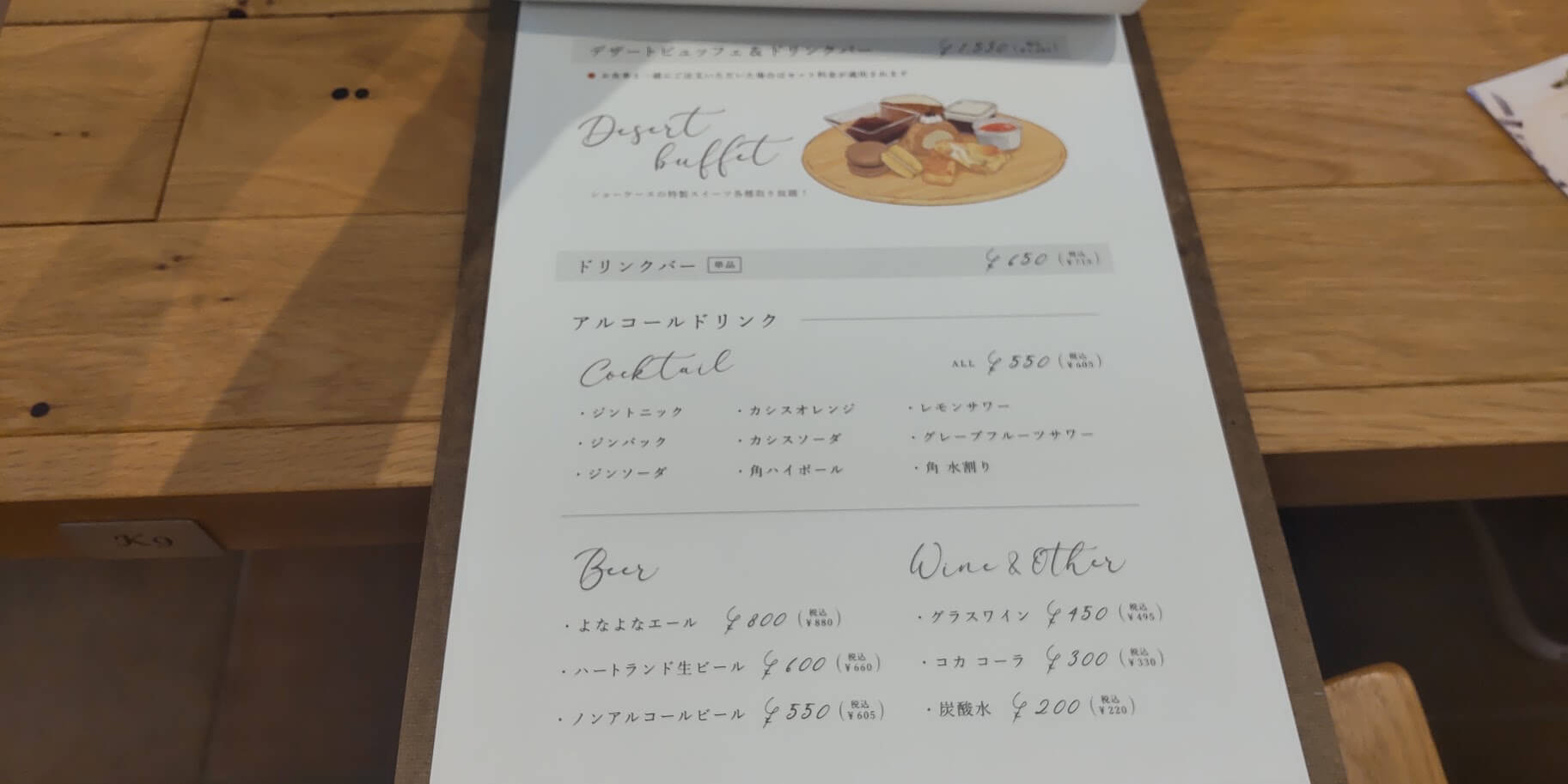 写真ぼやけてしまっていますが、食事を注文しない場合のドリンクバー&デザートビュッフェの価格は1683円(税込)だったと思います。