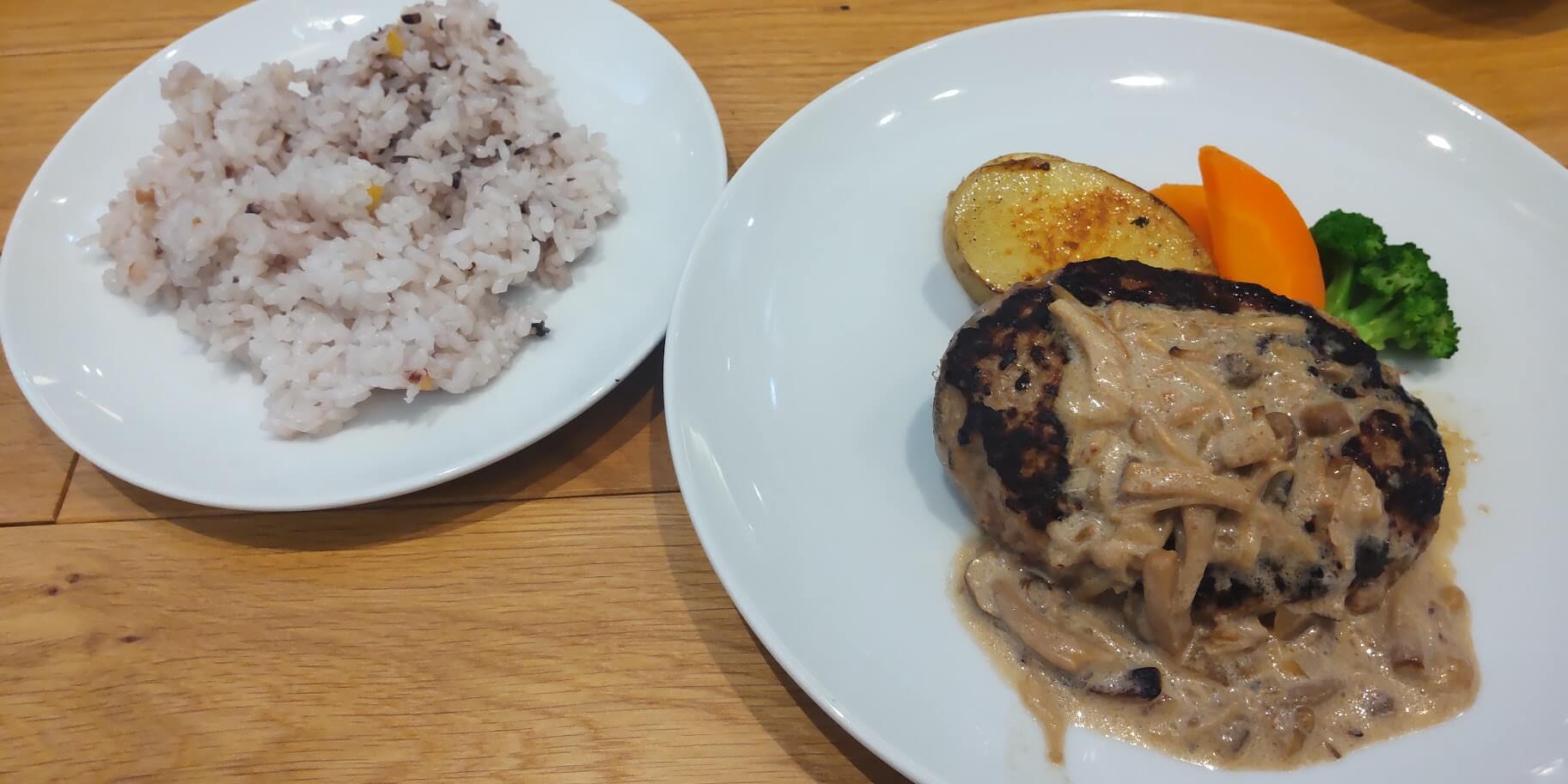 なんとサラダとスープの到着から30分経ってやっとメインのハンバーグと雑穀ご飯がやってきました。