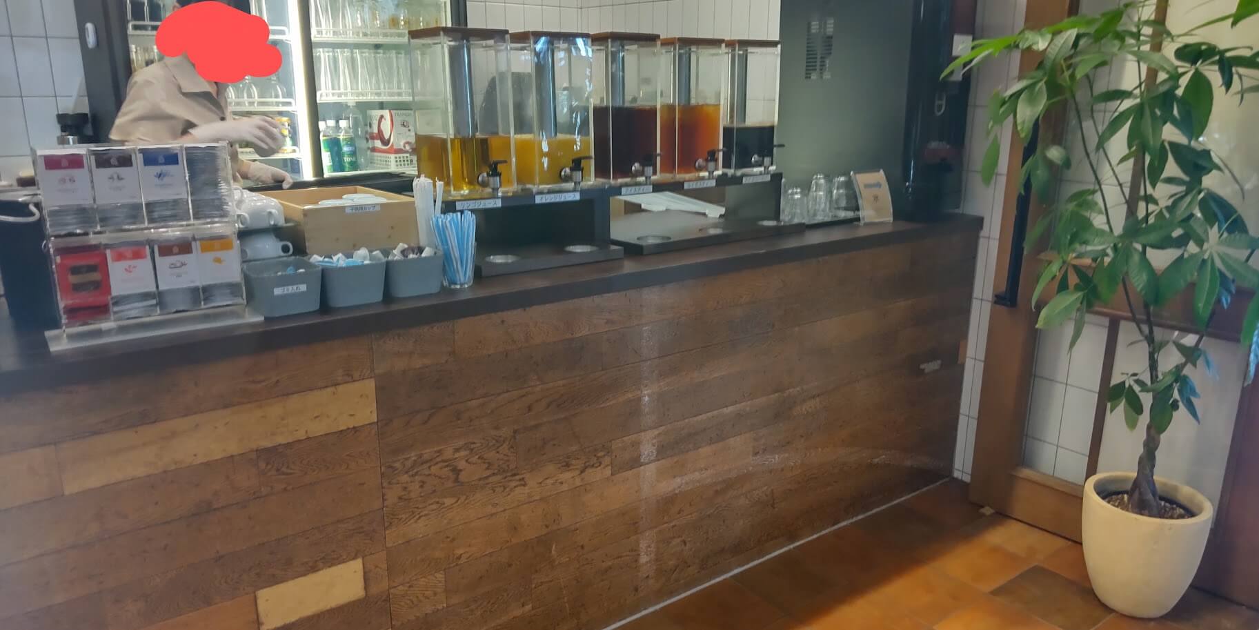 写真奥に見えるのがデザートビュッフェのショーケース、その右にあるのがドリンクバーのコーナーです。