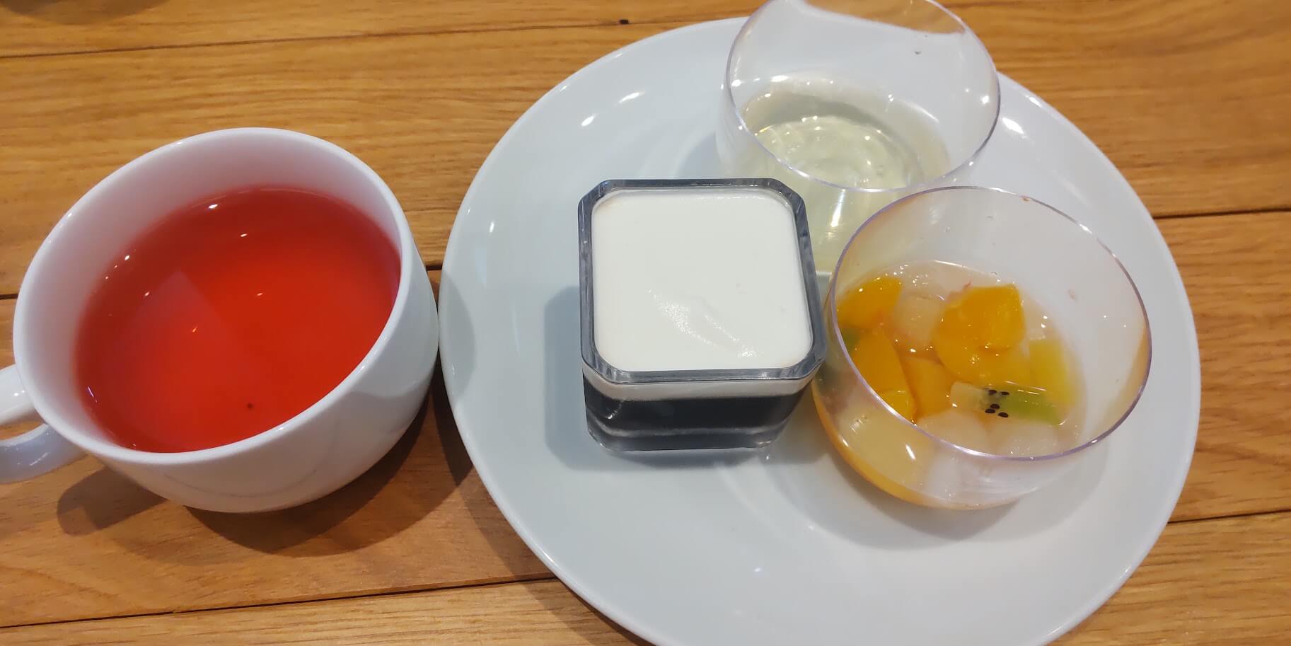 ローズヒップティーとコーヒーゼリー、ぶどうジュレにフルーツゼリーだったかな。