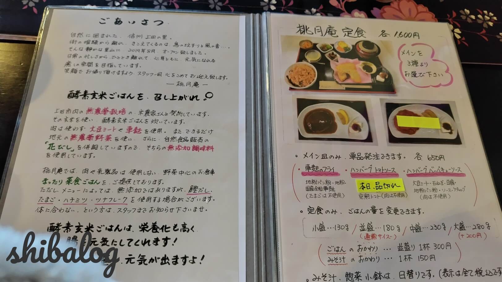 桃月庵の看板メニューは桃月庵定食(1600円・税込)で、車麩のフライ・ハンバーグトマトソース・ハンバーグバーベキューソースの3種類からメインを選ぶスタイルです。